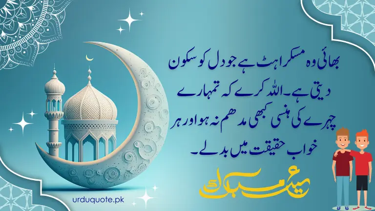 Roman Urdu: Bhai woh muskurahat hai jo dil ko sukoon deti hai. Allah kare ke tumhare chehre ki hansi kabhi madhyam na ho aur har khwab haqeeqat mein badle.