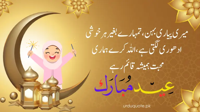 Roman Urdu: Meri pyaari behan, Allah kare yeh Eid tumhari zindagi mein khushiyon aur kamiyabiyon ki roshni lekar aaye. Eid Mubarak!